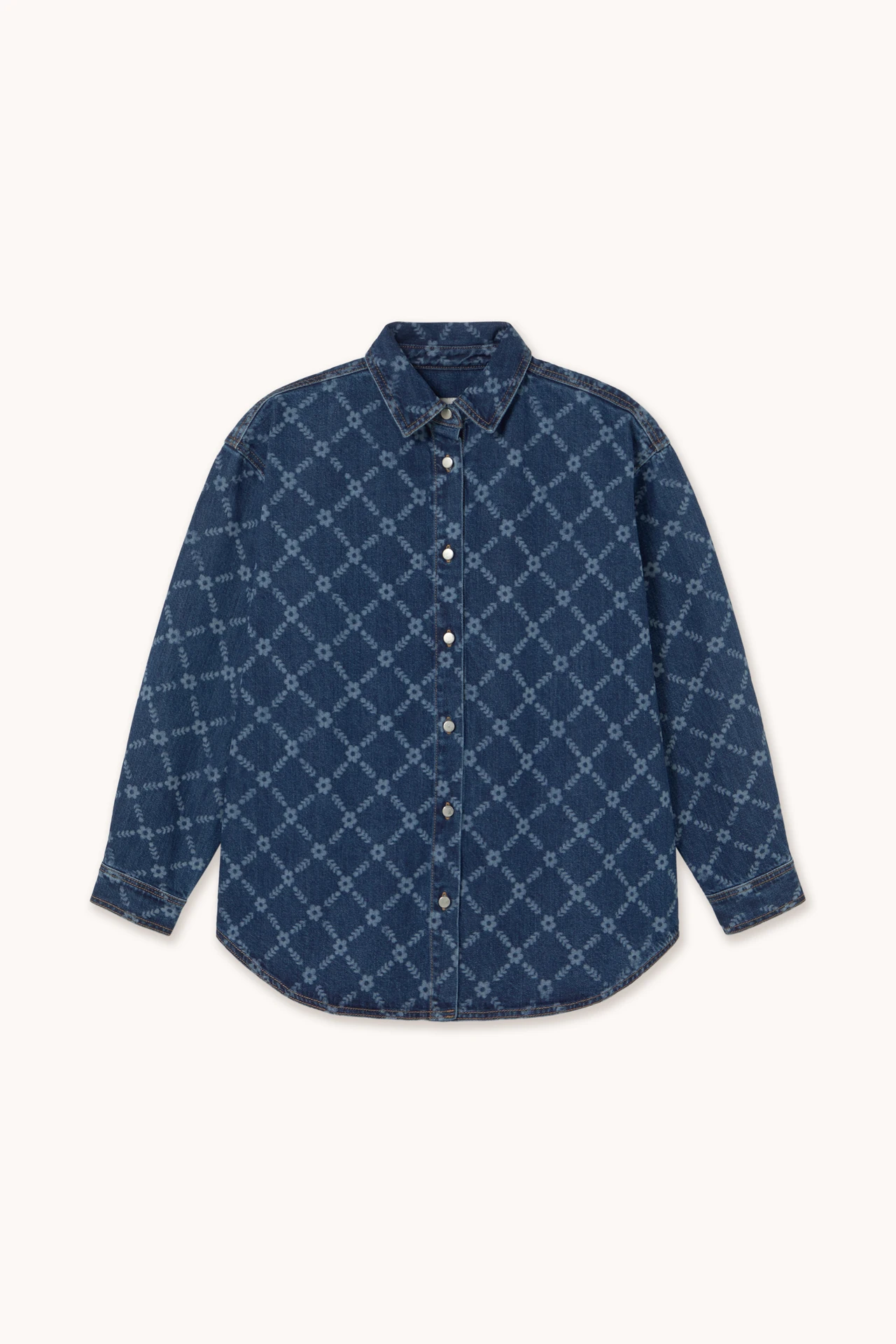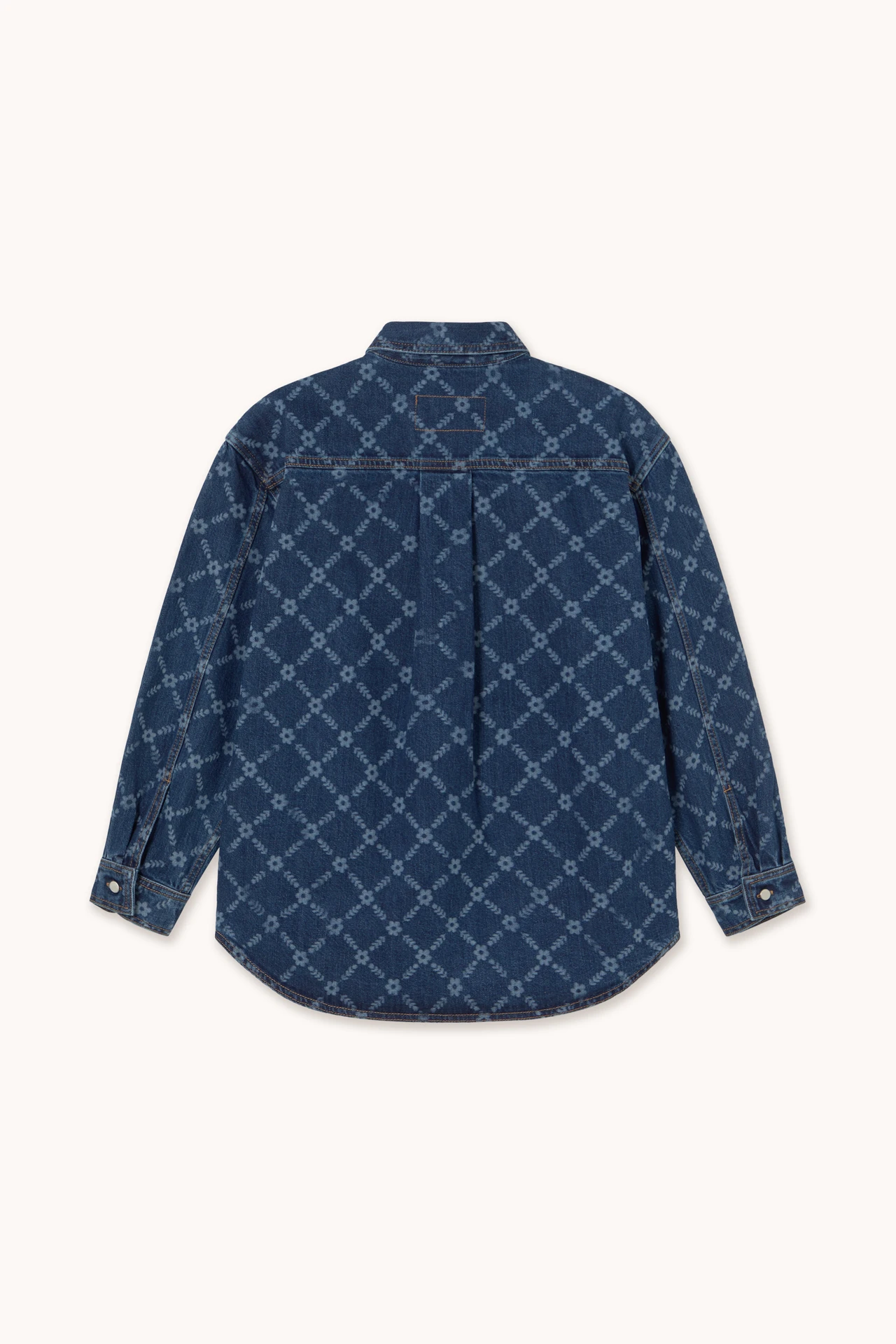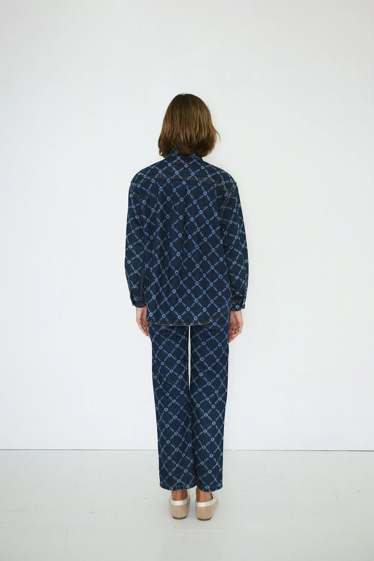 Deep indigo denim shirt featuring laser-printed grid stripes and a front opening with contrasting silver buttons. Designed with a back yoke and buttoned sleeves, it pairs perfectly with matching denim for a coordinated, contemporary look.