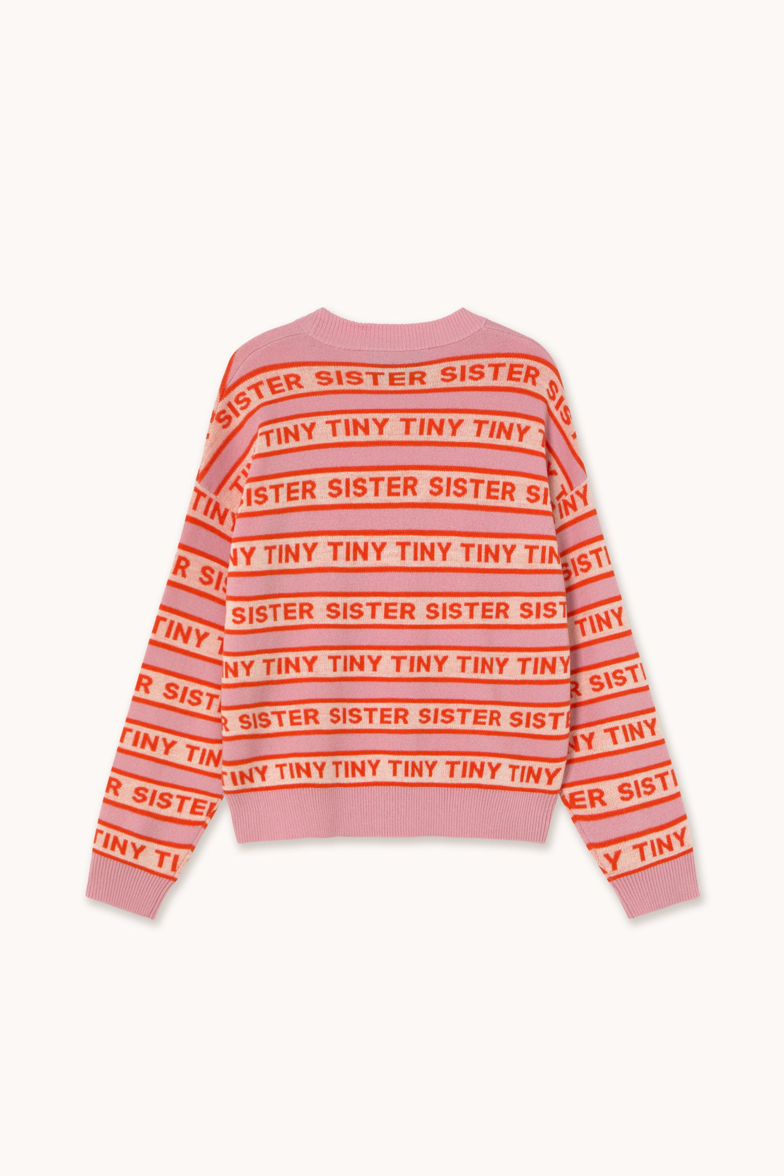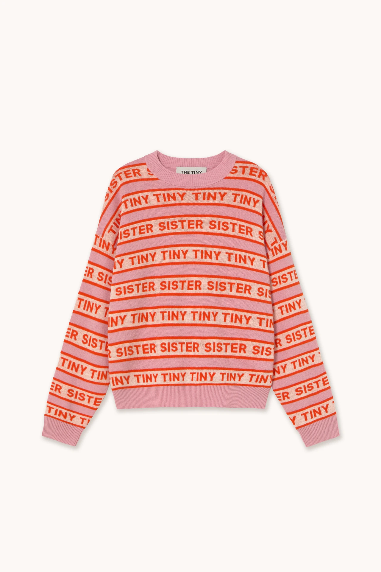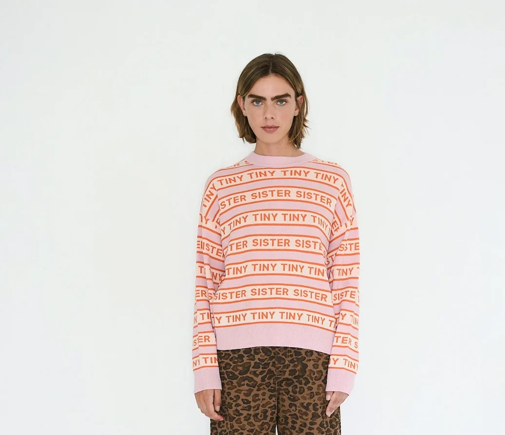 A modern silhouette crafted from extrafine merino wool. This sweater features a striped jacquard pattern with an integrated logo, set against a wild rose base with accents in bright summer red and light cream. Finished with a round neck and ribbed hems.