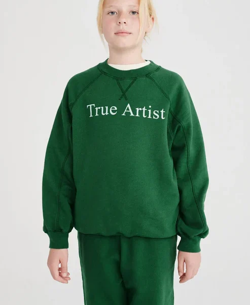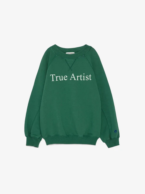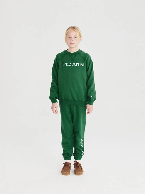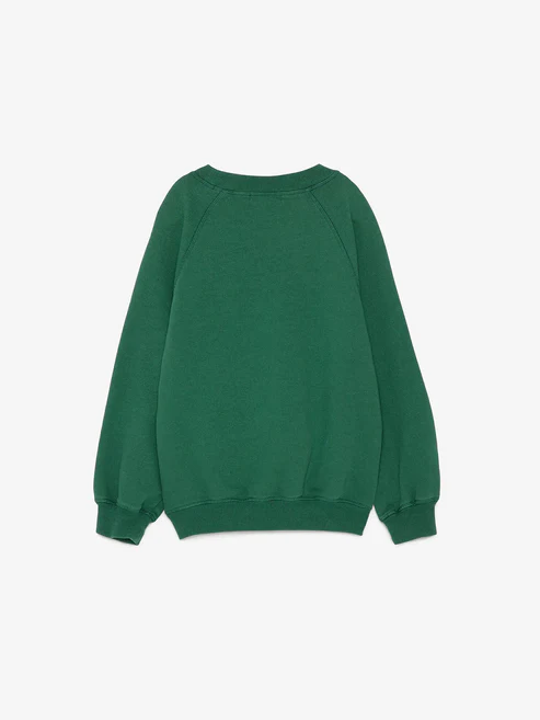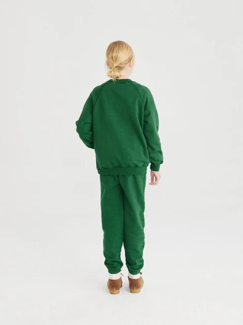 Sweatshirt nº01 in Verdant Green is made of 98% organic cotton and 2% elastane fleece and has our logo printed on the front. It is designed with raglan sleeves, ribbed at cuffs and bottom, and has our bird logo embroidered on the sleeve. It has a loose fit.